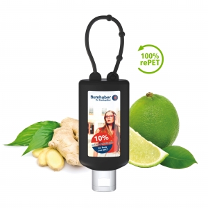 Artikel-Nr: SAN20-314-199-100Praktische Kosmetikflasche zum Anhängen! Das Fläschchen mit Silikonhülle ist nicht nur optisch ein echter Hingucker! Raffiniert mit Schlaufe zum an die Handtasche, an den Rucksack oder an den Trolli. 50 ml Flasche und Klappdeckel (zufällig ausgerichtet) weiß; Silikonhülle und Schlaufe in Nachfüllbar. Flasche hergestellt aus 100% recyceltem PET, weiß mit leichter R-PET-Färbung. Handbalsam Ingwer-Limette: Ingwer wird in der traditionellen chinesischen Medizin häufig aufgrund seiner reizlindernden Wirkung eingesetzt. Er enthält Inhaltsstoffe, die freie Radikale abfangen, regt die Mikrozirkulation der Haut an, wirkt anregend und wärmend. In diesem schnell einziehenden Feuchtigkeitsbalsam rundet die Frische von Limetten das natürliche Aroma des Ingwers zu einer stimmigen Duftkomposition ab. Eine frische Handcreme für Sie und Ihn! • Vegan • pH-hautneutral • Ohne Parabene • Dermatologisch getestet "Sehr gut hautverträglich" • Hergestellt in Deutschland Dekoration: Body Label: Etikett PE (weiß) auf Vorder- und Rückseite, Druck 4c CMYK. Wahlweise glänzend oder matt. Füllung: 50ml