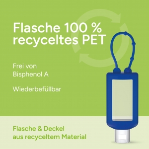 Artikel-Nr: SAN20-311-260-100Praktische Kosmetikflasche zum Anhängen! Das Fläschchen mit Silikonhülle ist nicht nur optisch ein echter Hingucker! Raffiniert mit Schlaufe zum Anhängen ans Handgepäck, an den Rucksack oder an den Kinderwagen. 50 ml Flasche aus 100% recyceltem PET, transparent mit leichter R-PET-Färbung. Mit Klappdeckel "weiß" aus recyceltem PP, zufällig ausgerichtet; Silikonhülle und Schlaufe in Nachfüllbar. Hygiene ist für jedermann Thema: Das alkoholische Handreinigungsgel ist der ideale Begleiter im Alltag. Prompt und einfach ohne Wasser anwendbar: Die Hände fühlen sich sofort sauber und gepflegt an. • Vegan • pH-hautneutral • Ohne Parabene • Ohne Konservierungsstoffe • Dermatologisch getestet "Sehr gut hautverträglich" • Hergestellt in Deutschland. Dekoration: Body Label: Etikett PE (weiß) auf Vorder- und Rückseite, Druck 4c CMYK. Wahlweise glänzend oder matt. Füllung: 50ml