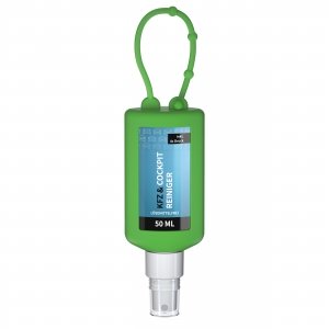 Artikel-Nr: SAN20-312-267-100Praktische Kosmetikflasche zum Anhängen! Das Spray mit Silikonhülle ist nicht nur optisch ein echter Hingucker! Raffiniert mit Schlaufe zum Anhängen an de Strandtasche, den Wander-Rucksack, den Ski-Anorak oder an den Kinderwagen. 50 ml PET Flasche (weiß) mit weißem Pumpaufsatz und transparenter Schutzkappe; Silikonhülle und Schlaufe in Nachfüllbar. Flasche hergestellt aus 100% recyceltem PET, weiß mit leichter R-PET-Färbung. Das Reinigungsspray entfernt Verschmutzungen materialschonend. Es ist bestens geeignet für die schnelle und unkomplizierte Reinigung des gesamten Kfz Cockpits, insbesondere von Displays und Lenkrad sowie allen anderen Oberflächen. Anwendung ohne Wasser: Aufsprühen, kurz einwirken lassen und mit einem Tuch abwischen. Der Reiniger hinterlässt einen angenehmen, frischen Zitronenduft und einen matten Glanz. • Lösemittelfrei • Native Rohstoffe • Biologisch abbaubar • Vegan • Hergestellt in Deutschland Dekoration: Body Label: Etikett PE (weiß), Druck 4c CMYK. Wahlweise glänzend oder matt.