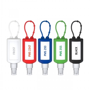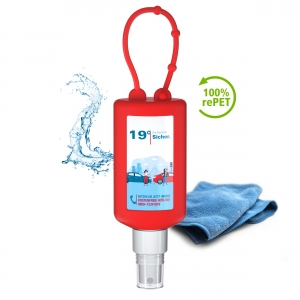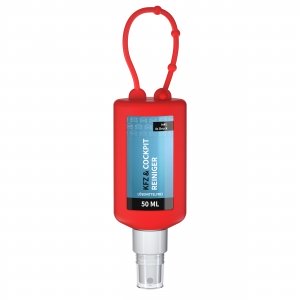Artikel-Nr: SAN20-310-267-100Praktische Kosmetikflasche zum Anhängen! Das Spray mit Silikonhülle ist nicht nur optisch ein echter Hingucker! Raffiniert mit Schlaufe zum Anhängen an de Strandtasche, den Wander-Rucksack, den Ski-Anorak oder an den Kinderwagen. 50 ml PET Flasche (weiß) mit weißem Pumpaufsatz und transparenter Schutzkappe; Silikonhülle und Schlaufe in Nachfüllbar. Flasche hergestellt aus 100% recyceltem PET, weiß mit leichter R-PET-Färbung. Das Reinigungsspray entfernt Verschmutzungen materialschonend. Es ist bestens geeignet für die schnelle und unkomplizierte Reinigung des gesamten Kfz Cockpits, insbesondere von Displays und Lenkrad sowie allen anderen Oberflächen. Anwendung ohne Wasser: Aufsprühen, kurz einwirken lassen und mit einem Tuch abwischen. Der Reiniger hinterlässt einen angenehmen, frischen Zitronenduft und einen matten Glanz. • Lösemittelfrei • Native Rohstoffe • Biologisch abbaubar • Vegan • Hergestellt in Deutschland Dekoration: Body Label: Etikett PE (weiß), Druck 4c CMYK. Wahlweise glänzend oder matt.