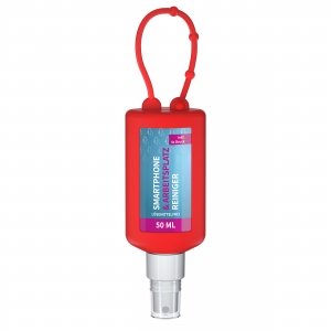 Artikel-Nr: SAN20-310-266-100Praktische Kosmetikflasche zum Anhängen! Das Spray mit Silikonhülle ist nicht nur optisch ein echter Hingucker! Raffiniert mit Schlaufe zum Anhängen an de Strandtasche, den Wander-Rucksack, den Ski-Anorak oder an den Kinderwagen. 50 ml PET Flasche (weiß) mit weißem Pumpaufsatz und transparenter Schutzkappe; Silikonhülle und Schlaufe in Nachfüllbar. Flasche hergestellt aus 100% recyceltem PET, weiß mit leichter R-PET-Färbung. Das Reinigungsspray entfernt materialschonend Verschmutzungen von Smartphone und Tablet sowie allen anderen Oberflächen am Arbeitsplatz. Es ist bestens geeignet für die schnelle und unkomplizierte Reinigung von Maus, Tastatur, Telefon, Laptop und Tischplatte. Anwendung ohne Wasser: Aufsprühen, kurz einwirken lassen und mit einem Tuch abwischen. Der Reiniger hinterlässt einen angenehmen, frischen Zitronenduft und einen matten Glanz. • Lösemittelfrei • Native Rohstoffe • Biologisch abbaubar • Vegan • Hergestellt in Deutschland Dekoration: Body Label: Etikett PE (weiß), Druck 4c CMYK. Wahlweise glänzend oder matt.
