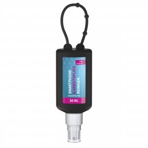 Artikel-Nr: SAN20-314-266-100Praktische Kosmetikflasche zum Anhängen! Das Spray mit Silikonhülle ist nicht nur optisch ein echter Hingucker! Raffiniert mit Schlaufe zum Anhängen an de Strandtasche, den Wander-Rucksack, den Ski-Anorak oder an den Kinderwagen. 50 ml PET Flasche (weiß) mit weißem Pumpaufsatz und transparenter Schutzkappe; Silikonhülle und Schlaufe in Nachfüllbar. Flasche hergestellt aus 100% recyceltem PET, weiß mit leichter R-PET-Färbung. Das Reinigungsspray entfernt materialschonend Verschmutzungen von Smartphone und Tablet sowie allen anderen Oberflächen am Arbeitsplatz. Es ist bestens geeignet für die schnelle und unkomplizierte Reinigung von Maus, Tastatur, Telefon, Laptop und Tischplatte. Anwendung ohne Wasser: Aufsprühen, kurz einwirken lassen und mit einem Tuch abwischen. Der Reiniger hinterlässt einen angenehmen, frischen Zitronenduft und einen matten Glanz. • Lösemittelfrei • Native Rohstoffe • Biologisch abbaubar • Vegan • Hergestellt in Deutschland Dekoration: Body Label: Etikett PE (weiß), Druck 4c CMYK. Wahlweise glänzend oder matt.