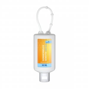 Artikel-Nr: SAN20-313-226-100Praktische Kosmetikflasche zum Anhängen! Das Fläschchen mit Silikonhülle ist nicht nur optisch ein echter Hingucker! Raffiniert mit Schlaufe zum die Badetasche, den Rucksack oder den Kinderwagen. 50 ml Flasche und Klappdeckel (zufällig ausgerichtet) weiß; Silikonhülle und Schlaufe in Nachfüllbar. Flasche hergestellt aus 100% recyceltem PET, weiß mit leichter R-PET-Färbung. Sensitive Sonnenmilch - LSF 30, parfümfrei ohne Duftstoffe (Hohes Schutzniveau). Wasserfeste und schnell einziehende Sonnencreme mit Vitamin E und Glycerin für 24-Stunden-Langzeitfeuchtigkeit. Sofortschutz mit ausgewogenem UVA- / UVB-Breitbandfilter. • Ohne Octocrylene • Nanofrei, vegan • Kein Mikroplastik • Keine Parabene, Mineralöle, Silikone • Korallenfreundlich gemäß Hawaii-Riffgesetz • Klinisch und dermatologisch getestet "Sehr gut hautverträglich" • Hergestellt in Deutschland Dekoration: Body Label: Etikett PE (weiß) auf Vorder- und Rückseite, Druck 4c CMYK. Wahlweise glänzend oder matt.