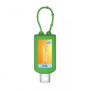 Artikel-Nr: SAN20-312-226-100Praktische Kosmetikflasche zum Anhängen! Das Fläschchen mit Silikonhülle ist nicht nur optisch ein echter Hingucker! Raffiniert mit Schlaufe zum die Badetasche, den Rucksack oder den Kinderwagen. 50 ml Flasche und Klappdeckel (zufällig ausgerichtet) weiß; Silikonhülle und Schlaufe in Nachfüllbar. Flasche hergestellt aus 100% recyceltem PET, weiß mit leichter R-PET-Färbung. Sensitive Sonnenmilch - LSF 30, parfümfrei ohne Duftstoffe (Hohes Schutzniveau). Wasserfeste und schnell einziehende Sonnencreme mit Vitamin E und Glycerin für 24-Stunden-Langzeitfeuchtigkeit. Sofortschutz mit ausgewogenem UVA- / UVB-Breitbandfilter. • Ohne Octocrylene • Nanofrei, vegan • Kein Mikroplastik • Keine Parabene, Mineralöle, Silikone • Korallenfreundlich gemäß Hawaii-Riffgesetz • Klinisch und dermatologisch getestet "Sehr gut hautverträglich" • Hergestellt in Deutschland Dekoration: Body Label: Etikett PE (weiß) auf Vorder- und Rückseite, Druck 4c CMYK. Wahlweise glänzend oder matt.
