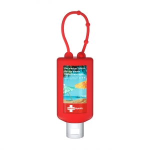 Artikel-Nr: SAN20-310-226-100Praktische Kosmetikflasche zum Anhängen! Das Fläschchen mit Silikonhülle ist nicht nur optisch ein echter Hingucker! Raffiniert mit Schlaufe zum die Badetasche, den Rucksack oder den Kinderwagen. 50 ml Flasche und Klappdeckel (zufällig ausgerichtet) weiß; Silikonhülle und Schlaufe in Nachfüllbar. Flasche hergestellt aus 100% recyceltem PET, weiß mit leichter R-PET-Färbung. Sensitive Sonnenmilch - LSF 30, parfümfrei ohne Duftstoffe (Hohes Schutzniveau). Wasserfeste und schnell einziehende Sonnencreme mit Vitamin E und Glycerin für 24-Stunden-Langzeitfeuchtigkeit. Sofortschutz mit ausgewogenem UVA- / UVB-Breitbandfilter. • Ohne Octocrylene • Nanofrei, vegan • Kein Mikroplastik • Keine Parabene, Mineralöle, Silikone • Korallenfreundlich gemäß Hawaii-Riffgesetz • Klinisch und dermatologisch getestet "Sehr gut hautverträglich" • Hergestellt in Deutschland Dekoration: Body Label: Etikett PE (weiß) auf Vorder- und Rückseite, Druck 4c CMYK. Wahlweise glänzend oder matt.
