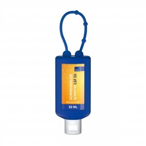 Artikel-Nr: SAN20-311-230-100Praktische Kosmetikflasche zum Anhängen! Das Fläschchen mit Silikonhülle ist nicht nur optisch ein echter Hingucker! Raffiniert mit Schlaufe zum die Badetasche, den Rucksack oder den Kinderwagen. 50 ml Flasche und Klappdeckel (zufällig ausgerichtet) weiß; Silikonhülle und Schlaufe in Nachfüllbar. Flasche hergestellt aus 100% recyceltem PET, weiß mit leichter R-PET-Färbung. Sensitive Sonnenmilch - LSF 50, parfümfrei ohne Duftstoffe (Hohes Schutzniveau). Wasserfeste und schnell einziehende Sonnencreme mit Vitamin E und Glycerin für 24-Stunden-Langzeitfeuchtigkeit. Sofortschutz mit ausgewogenem UVA- / UVB-Breitbandfilter. • Ohne Octocrylene • Vegan • Kein Mikroplastik • Keine Parabene, Mineralöle, Silikone • Korallenfreundlich gemäß Hawaii-Riffgesetz • Klinisch und dermatologisch getestet "Sehr gut hautverträglich" • Hergestellt in Deutschland Dekoration: Body Label: Etikett PE (weiß) auf Vorder- und Rückseite, Druck 4c CMYK. Wahlweise glänzend oder matt.