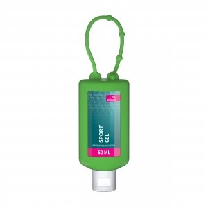 Artikel-Nr: SAN20-312-202-101Praktische Kosmetikflasche zum Anhängen! Das Fläschchen mit Silikonhülle ist nicht nur optisch ein echter Hingucker! Raffiniert mit Schlaufe zum den Wander-Rucksack, die Sport-Tasche oder ans Fahrrad. 50 ml Flasche und Klappdeckel (zufällig ausgerichtet) weiß; Silikonhülle und Schlaufe in Nachfüllbar. Flasche hergestellt aus 100% recyceltem PET, weiß mit leichter R-PET-Färbung. Das Muskel-Aktiv-Gel mit Kühleffekt! Sportgel: Anregendes Körpergel zur Massage der Haut sowie von Muskeln und Gelenken. Durch die Kombination von Latschenkiefern, Rosmarin- und Lavendelöl wirkt es aktivierend und belebend. Mit Kampfer und Menthol erfrischt es wohltuend nach einem anstrengenden Arbeitstag. Es ist besonders gut geeignet zur Lockerung der Muskeln nach dem Sport, bei Verspannungen oder Muskelkater. • Vegan • pH-hautneutral • Ohne Parabene • Ohne Konservierungsstoffe • Dermatologisch getestet "Sehr gut hautverträglich" • Hergestellt in Deutschland Dekoration: Body Label: Etikett PE (weiß) auf Vorder- und Rückseite, Druck 4c CMYK. Wahlweise glänzend oder matt. Füllung: 50ml