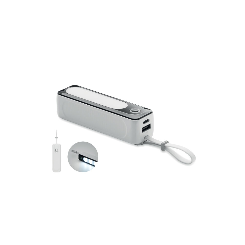 Artikel-Nr: OCBMO2178-065000 mAh Powerbank. ABS-Gehäuse. Mit COB Leuchte (6 LEDs) mit 4 Lichteinstellungen. Ausgangsstrom DC5V/2A 1x Typ A und 1x Typ C in / out. Inkl. integriertes USB-Kabel mit Typ-C-Stecker.