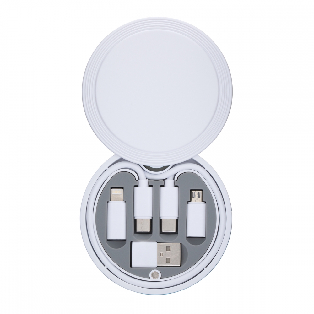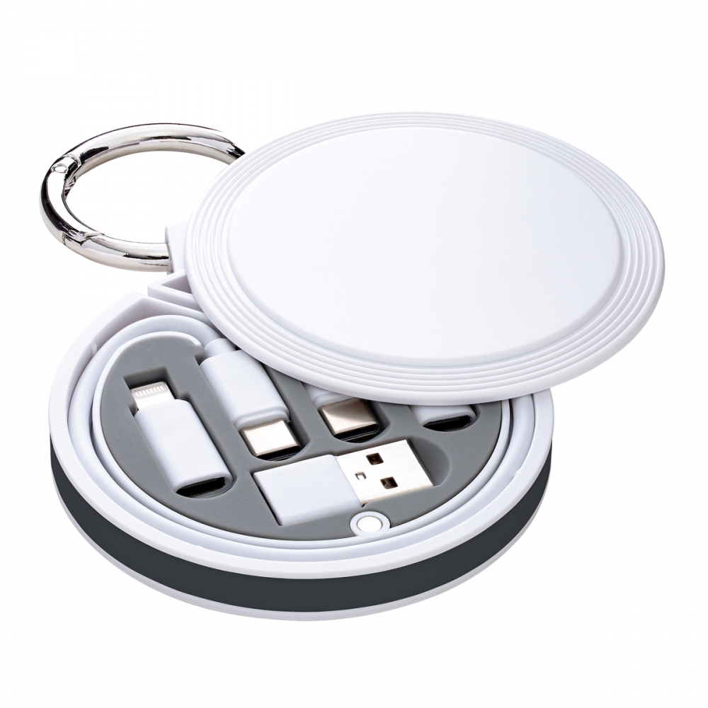 Artikel-Nr: RFS52575-WEDGYEndgeräte mit verschiedenen USB-Anschlüssen machen Ihnen mit REEVES-myConvertics keinen Ärger mehr. Besonders auf Reisen ist REEVES-myConvertics ein praktischer Begleiter, das handliche Case mit seitlich aufschwingendem Deckel beinhaltet ein USB-C auf USB-C-Ladekabel von 48 cm Länge, dazu Adapter für Micro-USB, Apple® 8 Pin und USB-A. Das Kabel ist in Abhängigkeit zu Endgerät und Adapter bis zu 60 Watt Fast Charge geeignet. Außerdem lässt sich das Kabel zur Datenübertragung einsetzen. Das Kabel und alle Stecker sind aus recyceltem TPE-Kunststoff hergestellt. Seitlich am flachen Gehäuse ist ein stabiler Karabiner angebracht, der Ihnen die Anbringung an Gepäck oder Innentaschen erleichtert. Das Gehäuse aus recyceltem ABS-Kunststoff bietet viel Raum für eine ausdrucksstarke Werbeanbringung. Die Veredelung kann mit einem großflächigen UV-Druck oder einem Tampondruck erfolgen. Tipp: Die Grafik bleibt durch den Öffnungsmechanismus immer sichtbar.6-in-1 Funktion:- USB-C zu USB-C- Mirco-USB zu USB-C- 8 Pin for Apple® zu USB-C- USB-C zu USB-A- Mirco-USB zu USB-A- Pin for Apple® zu USB-AApple® is a registered trademark of Apple Inc., registered in the US and other countries.