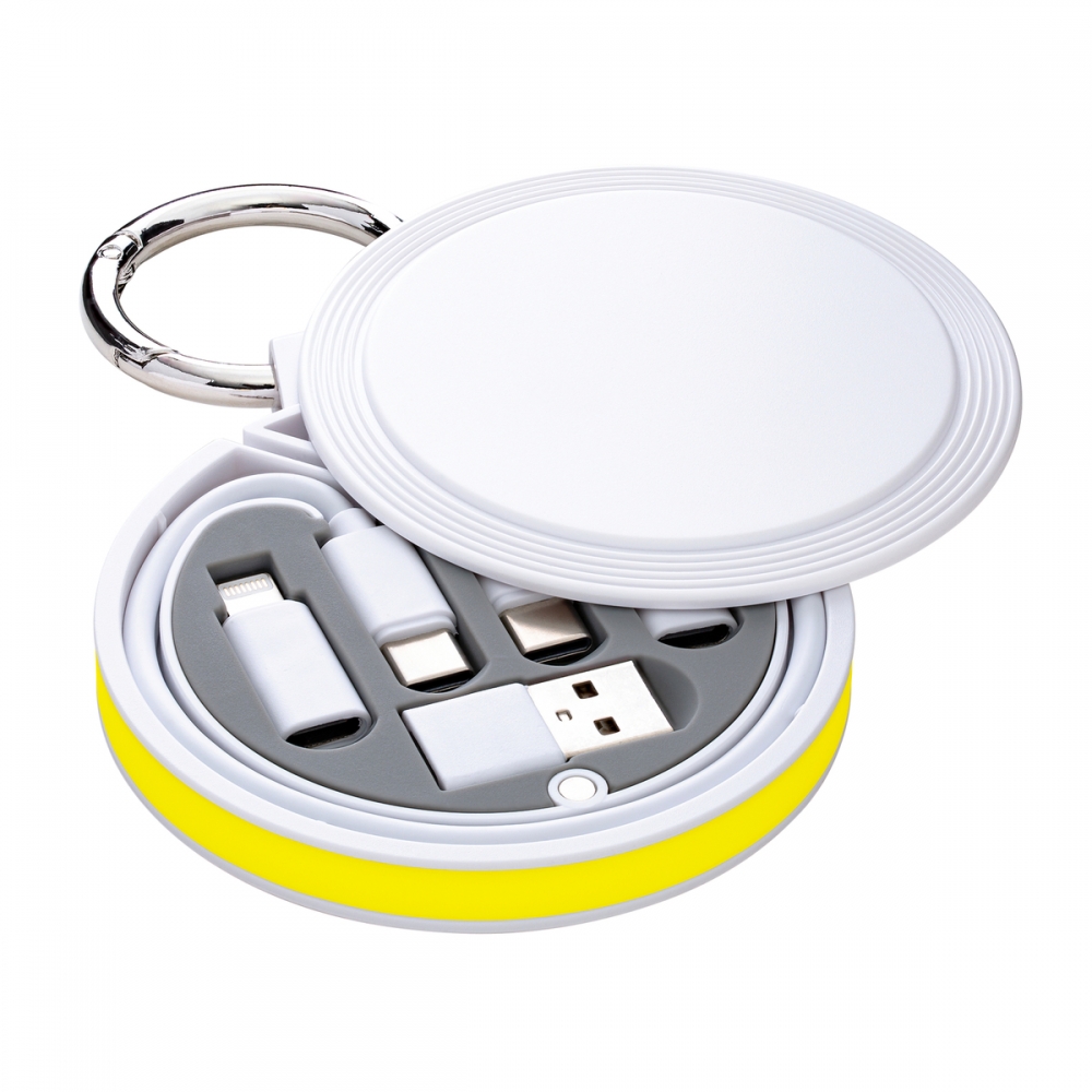 Artikel-Nr: RFS_S_52575-WE-RYWUnterschiedliche Anschlüsse und verschiedene Kabel machen Ihnen mit REEVES-myConvertics keine Sorgen mehr. REEVES-myConvertics enthält ein USB-C auf USB-C-Ladekabel von 48 cm Länge, dazu Adapter für Micro-USB, Apple® 8 Pin und USB-A. Das USB-C-Kabel ist in Abhängigkeit von Endgerät und Adapter bis zu 60 Watt Fast Charge geeignet. Darüber hinaus versorgt das Kabel das zu ladende Gerät nicht nur mit Strom, sondern ist auch für die Übertragung von Daten einsetzbar. Das Kabel und alle Stecker sind aus recyceltem TPE-Kunststoff hergestellt. 6-in-1 Funktion:- USB-C zu USB-C- Mirco-USB zu USB-C- 8 Pin for Apple® zu USB-C- USB-C zu USB-A- Mirco-USB zu USB-A- Pin for Apple® zu USB-AAlle Bestandteile sind in einem handlichen Gehäuse aus recyceltem ABS Kunststoff verstaut, das durch einen Verschluss zum Schieben und Drehen geöffnet wird und durch einen Magnet-Verschluss auch bei Erschütterungen fest verschlossen bleibt. Ein stabiler Karabiner macht die Befestigung am Rucksack oder ähnlichem leicht. myConvertics ist handlich flach und bietet eine besonders große und präsente Druckfläche. Die Werbeanbringung kann mit einem großflächigem UV-Druck oder einem Tampondruck erfolgen. Tipp: Das Logo bleibt auch bei Öffnen des Gehäuses sichtbar. Konfigurieren Sie Ihre Wunschfarben: Das Gehäuse kann in Schwarz oder Weiß gewählt und ein Silikonring aus 17 verschiedenen Farben ergänzt werden. So können Sie spielendleicht den Look des Cases an Ihr Design anpassen. Alle Komponenten sind ab Lager Köln verfügbar. Apple® is a registered trademark of Apple Inc., registered in the US and other countries.