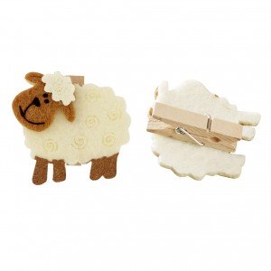 Sechs niedliche Schäfchen im Set aus Filz mit Holzklammer auf der Rückseite. Handgearbeitet. Maße: ca. 4,5 cm