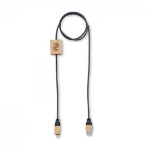 Artikel-Nr: OCBMO2520-4060W Ladekabel aus RPET mit Details aus Bambus. Eingang: 2-in-1 Typ-C und Typ-A. Ausgang: Typ-C und 2 in 1 Pin.