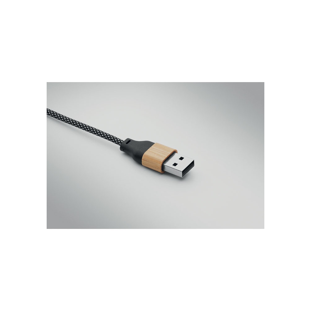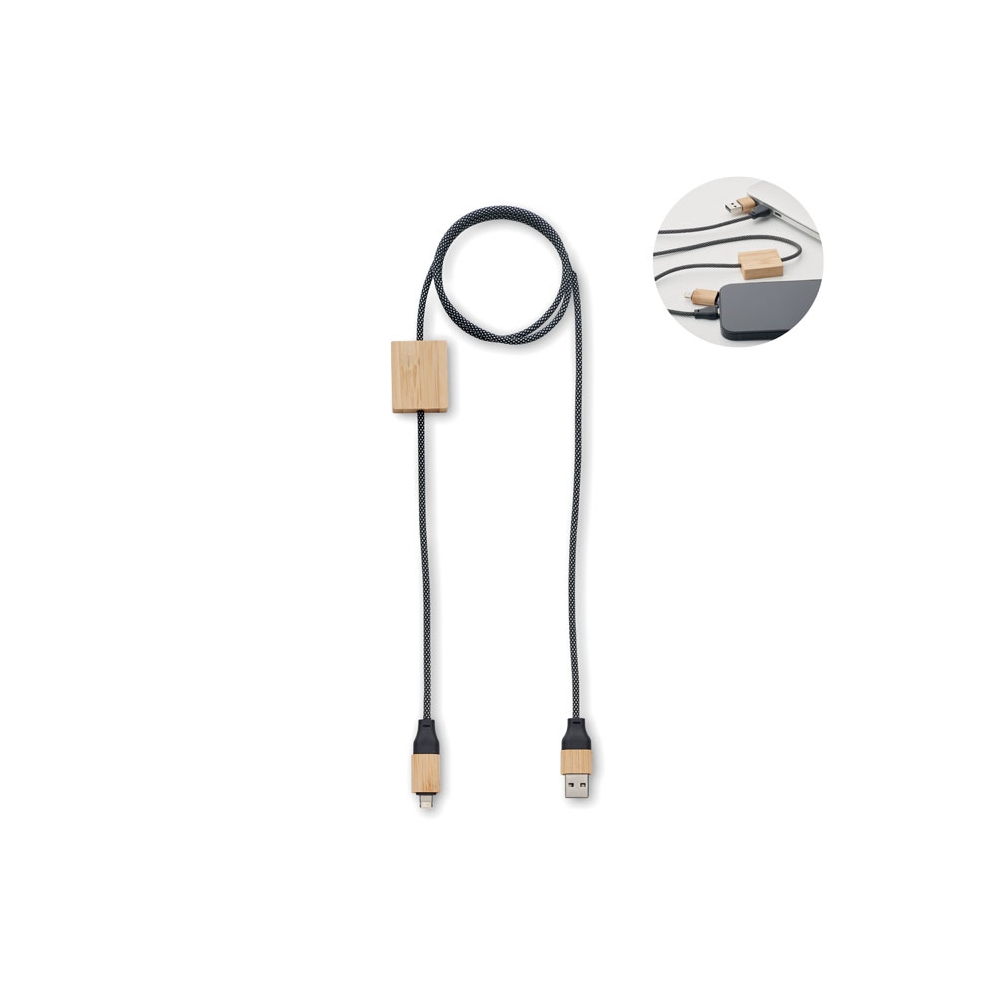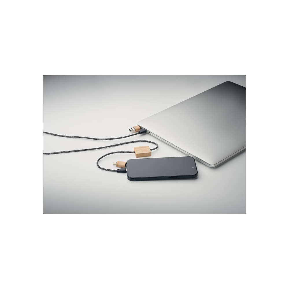 Artikel-Nr: OCBMO2520-4060W Ladekabel aus RPET mit Details aus Bambus. Eingang: 2-in-1 Typ-C und Typ-A. Ausgang: Typ-C und 2 in 1 Pin.