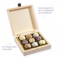 Artikel-Nr: 49430102Neun feine Trüffelpralinen aus bester belgischer Pralinenschokolade und köstlichen Canache-Füllungen finden in der attraktiven Holzkassette ihren Platz. Als hochwertiges Präsent für Adressaten mit Sinn für kleine Gaumen-freuden ist es ein ebenso persönliches wie geschmackvolles Geschenk. Durch den 4-farbigen Digitaldruck auf dem Deckel der Holzbox wird daraus ein ganz persönliches Präsent mit individueller Note.