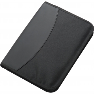 Artikel-Nr: EAG101103A4 Schreibmappe mit Reißverschluss aus strapazierfähigem Stoff mit diversen Fächern und einem neutralen, 40 seitigen Schreibblock. Ihre Werbung drucken wir vorne auf die Mappe, mittig auf den PU-Streifen.