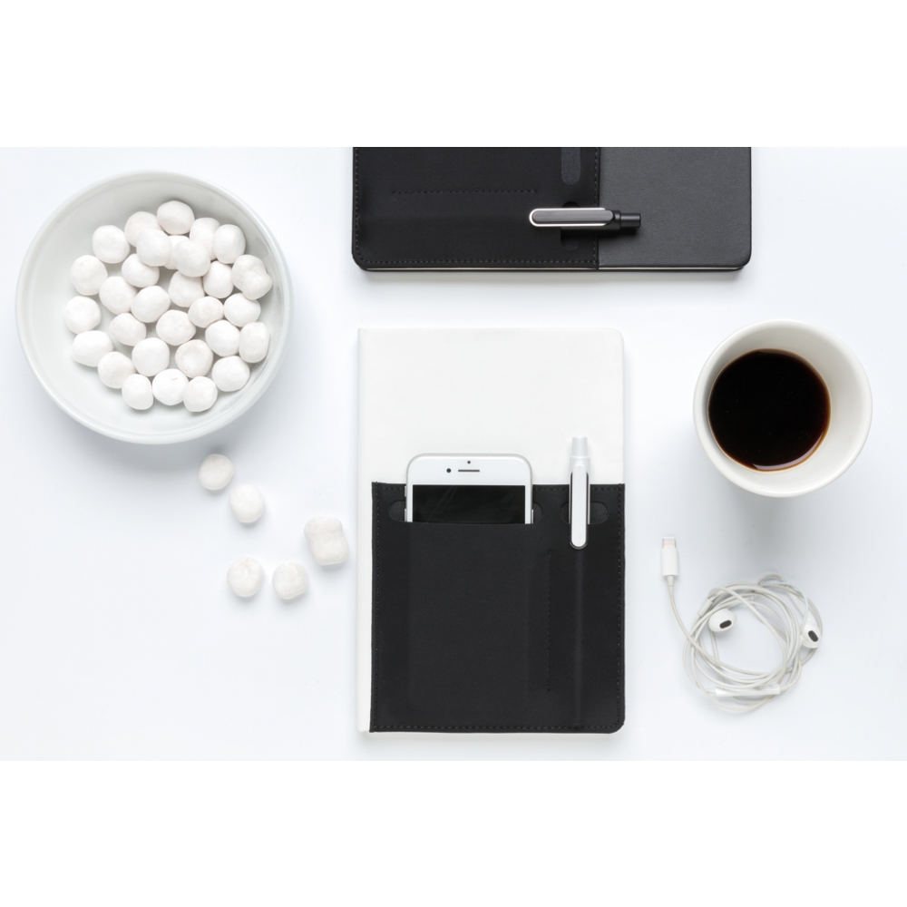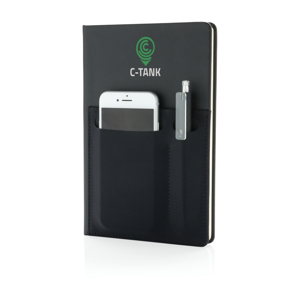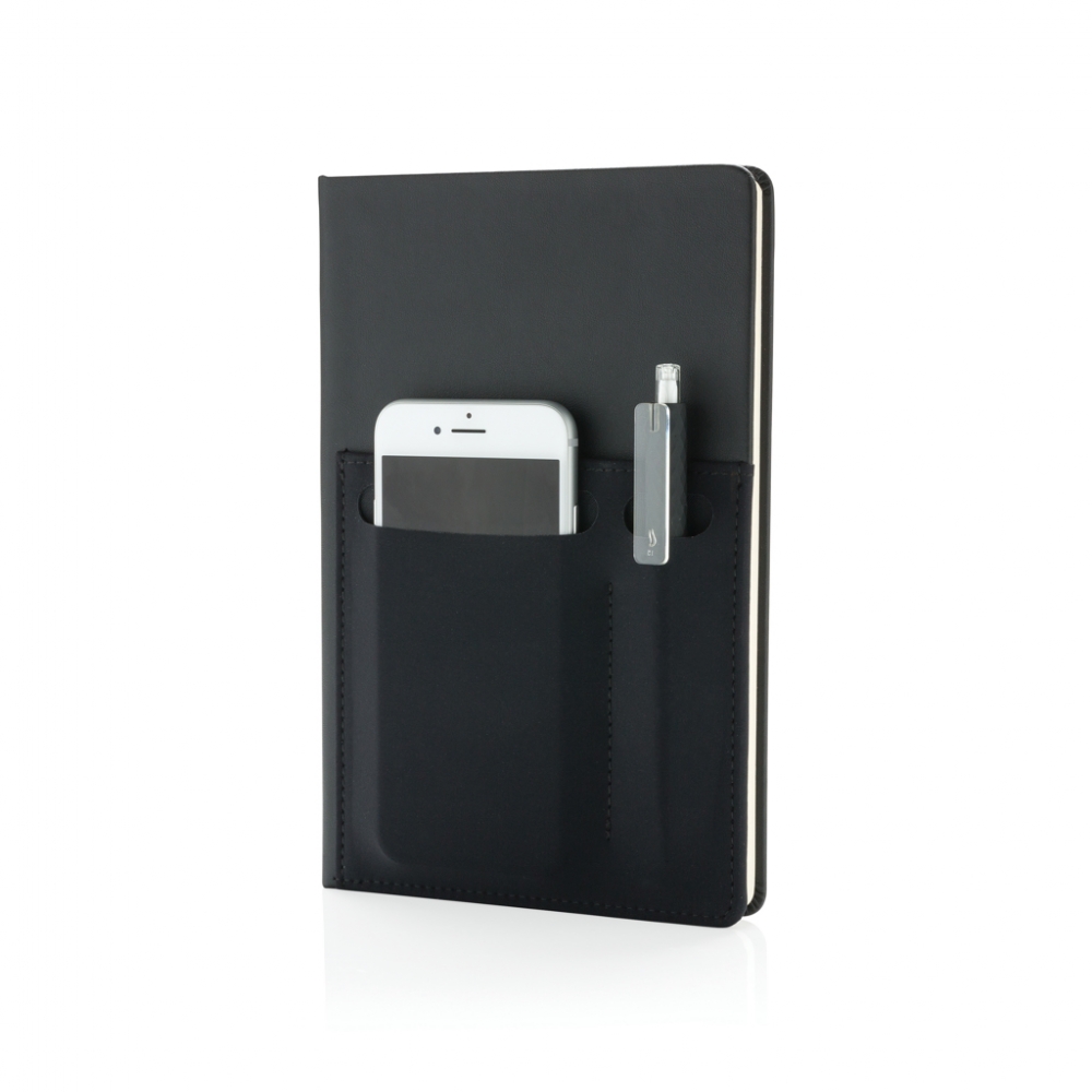 Artikel-Nr: XND773011A5 Notizbuch mit 160 cremefarbenen Seiten, liniert, 80g / m². Auf dem FrontCover ein Fach für Ihr Smartphone sowie einen Stift und einem größeren Fach für Dokumente. Smartphone für Geräte bis zu 8cm Breite ( wie z. B. iPhone 7 plus).