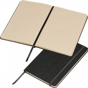 Artikel-Nr: EAG422803A5 Notizbuch mit gewebtem Einband aus recyceltem PET und 160 Seiten Zuckerrohrpapier. Es verfügt über ein Lesezeichen sowie ein Gummiverschlussband. Ihre Werbung drucken wir vorne auf den Einband.