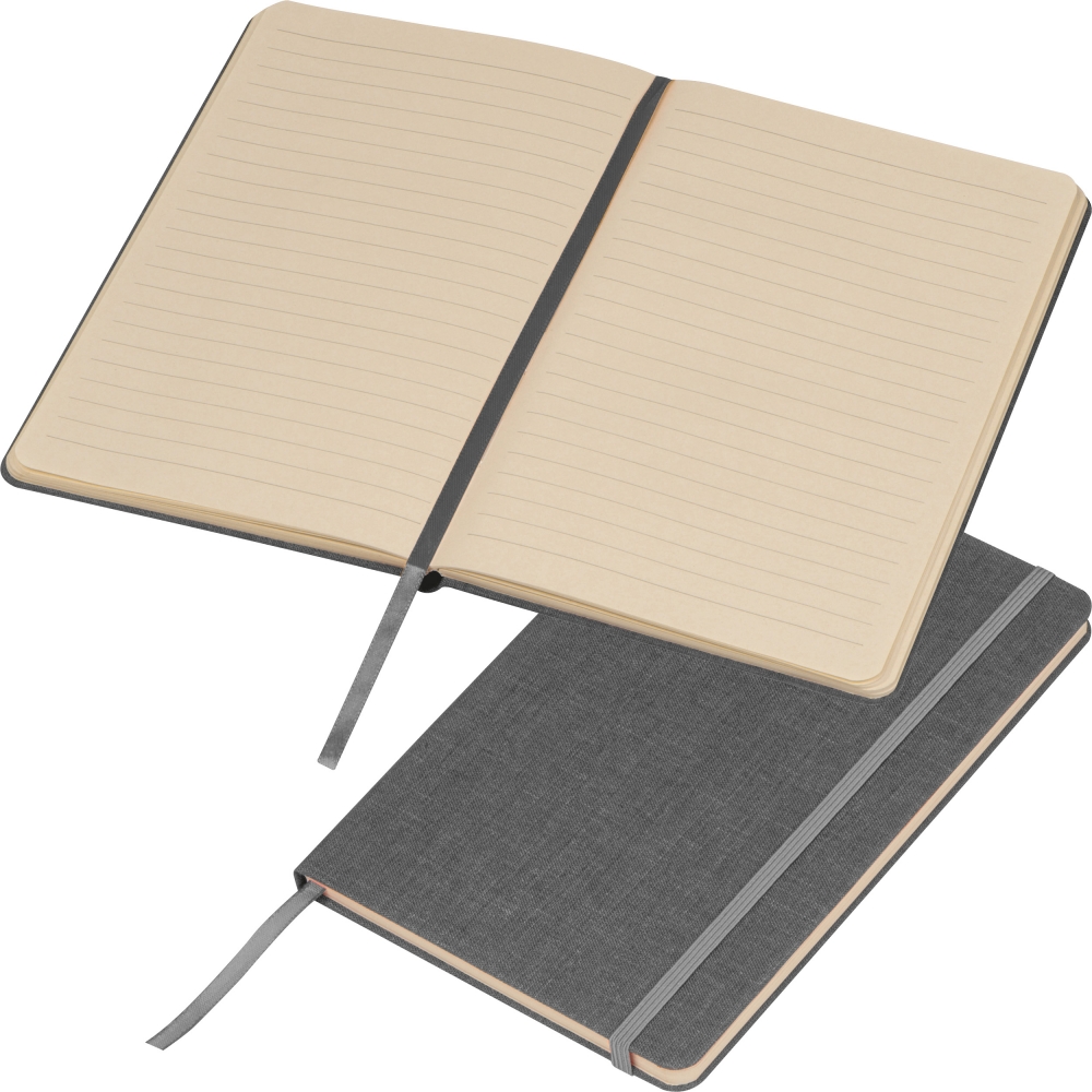 Artikel-Nr: EAG422807A5 Notizbuch mit gewebtem Einband aus recyceltem PET und 160 Seiten Zuckerrohrpapier. Es verfügt über ein Lesezeichen sowie ein Gummiverschlussband. Ihre Werbung drucken wir vorne auf den Einband.