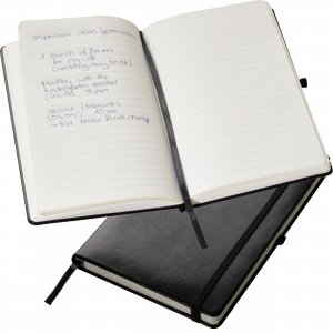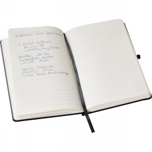 Artikel-Nr: MCM2763603Liniertes A5 Notizbuch mit Gummiband-Verschluss, 160 linierten Seiten, Kugelschreiberschlaufe, Lesebändchen und einer Falttasche im hinteren Buchdeckel. Ihre Werbung drucken wir auf den Kunstledereinband.