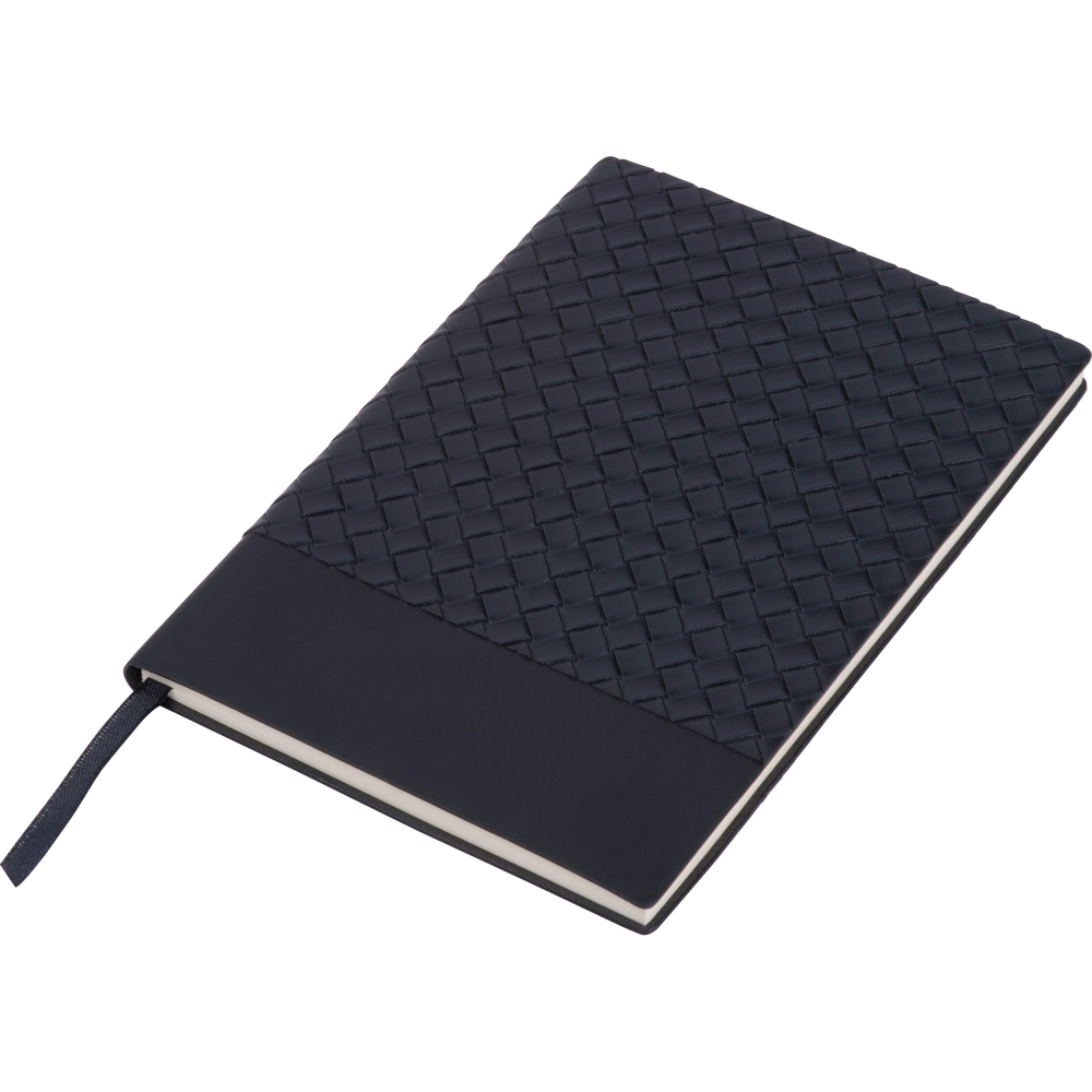 Artikel-Nr: EAG534603A5 Notizbuch mit flexiblem Soft-Cover aus PU, einem Lesezeichen und 192 linierten Seiten aus recyceltem Papier. Ihre Werbung drucken wir unterhalb der geflochtenen Fläche auf das Cover.