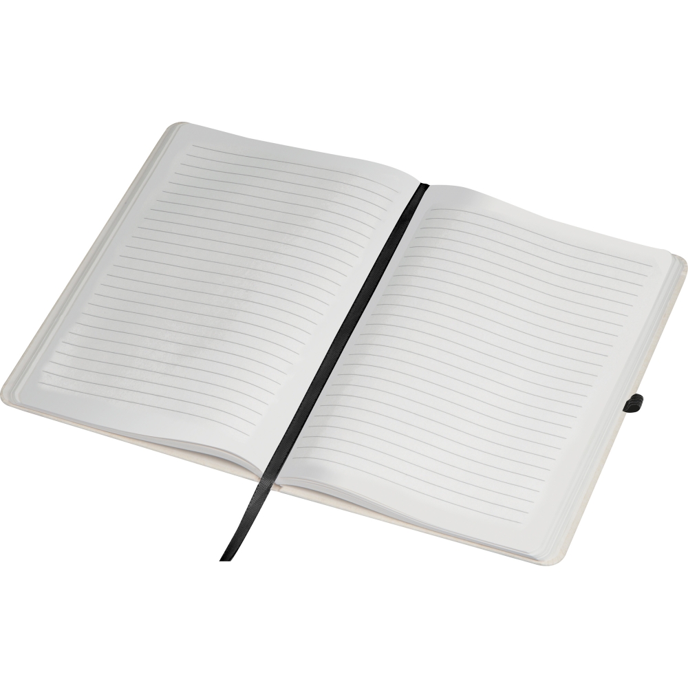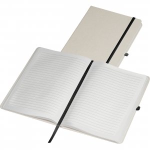 Artikel-Nr: EAG374713A5 Notizbuch aus recyceltem Milchkarton mit 160 linierten Seiten, Lesezeichen, Gummiverschlussband und Kugelschreiberschlaufe. Ihre Werbung drucken wir auf das Notizbuch.