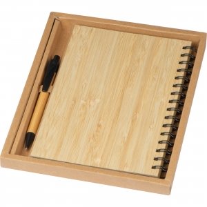 Artikel-Nr: EAG269913Schickes Öko-Set bestehend aus einem DIN A5 Notizbuch mit Bambuscover, Spiralbindung und 160 linierten Seiten aus recyceltem Papier sowie einem Bambus Kugelschreiber mit blauschreibender Kunststoffmine und Kunststoffapplikationen. Ihre Werbung gravieren wir außen auf das Notizbuchcover.