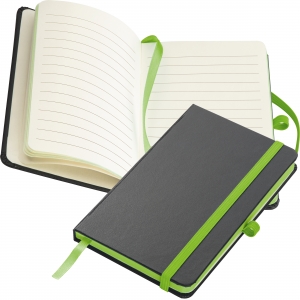 Artikel-Nr: EAG341129A6 Notizbuch im schwarzen PU-Einband mit Kugelschreiberschlaufe, Gummiverschlussband, Lesezeichen und 160 linierten Seiten. Ihre Werbung drucken wir vorne mittig auf das Cover.