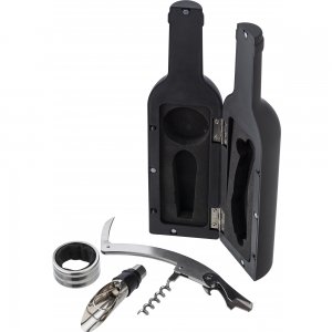 Artikel-Nr: GIV771631001Weinset aus ABS, mit Kellnermesser, Flaschenverschluss mit Ausgießer und Tropfenfänger. Geformt wie eine Weinflasche.