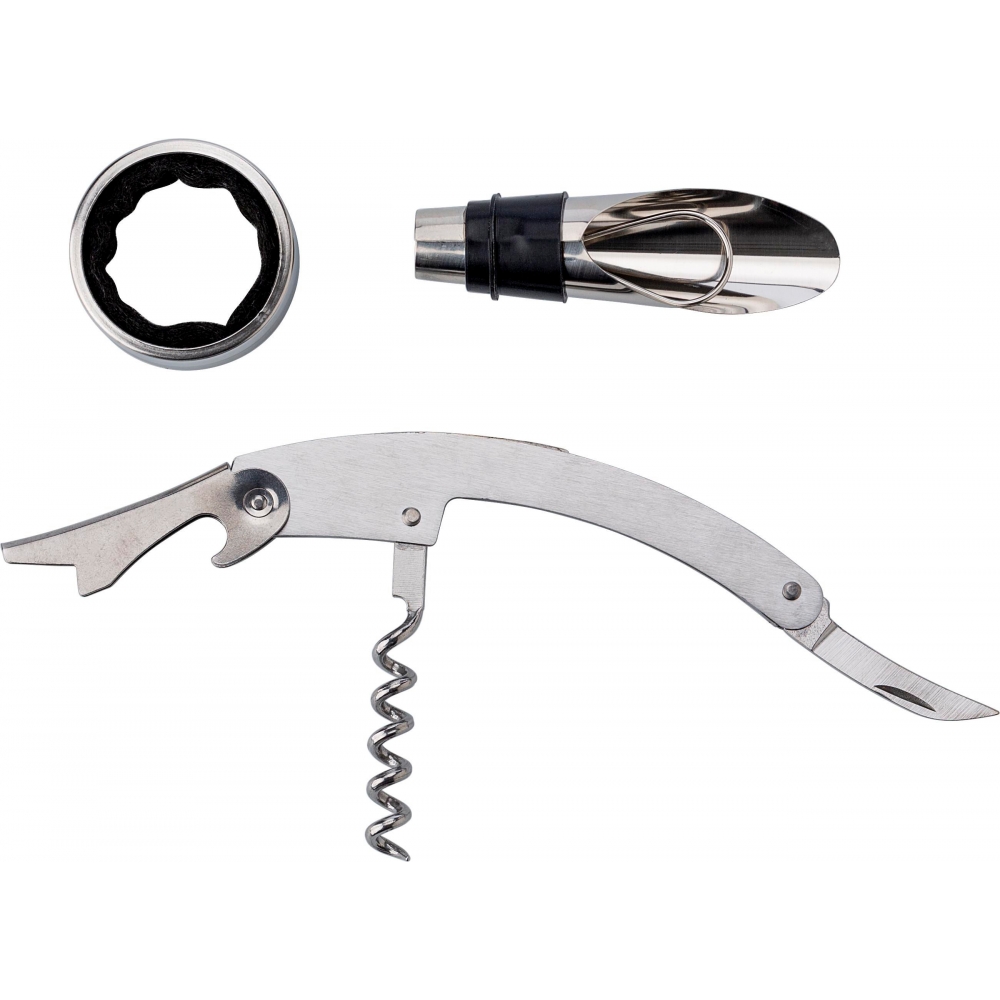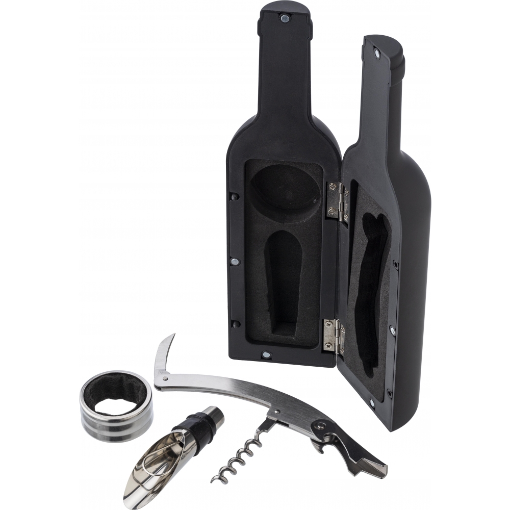Artikel-Nr: GIV771631001Weinset aus ABS, mit Kellnermesser, Flaschenverschluss mit Ausgießer und Tropfenfänger. Geformt wie eine Weinflasche.