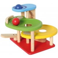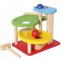Artikel-Nr: 375103056Aus Gummibaumholz. Mit zwei großen Holzkugeln (D.: 4,5 cm), einem Holzhammer und einem Katapult. Ab 18 Monaten. So geht's: Eine Kugel unten auf das Katapult legen und mit einem Hammerschlag nach oben befördern, dann rollt die Kugel langsam die Tellerbahn nach unten ´