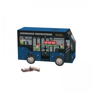 Artikel-Nr: PUC1275.00001Adventskalender Bus in Vollkartonhülle mit kompostierbarem Inlay, rundum individuell bedruckt. Inhalt: 24 Sarotti Schokoladentäfelchen in 4 verschiedenen Sorten (Vollmilch, Zartbitter, Haselnuss, Gianduja) bunt gemischt, 100g Saisonartikel - solange der Vorrat reicht!