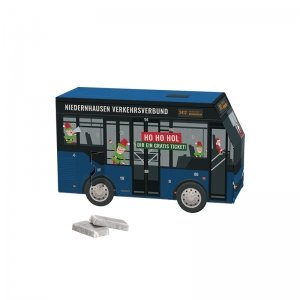 Artikel-Nr: PUC1275.00005Adventskalender Bus in Vollkartonhülle mit kompostierbarem Inlay, rundum individuell bedruckt. Inhalt: 24 Alpenmilch-Schokotäfelchen, eingewickelt in Pergaminpapier (kann über die Papiertonne entsorgt werden). Saisonartikel - solange der Vorrat reicht!