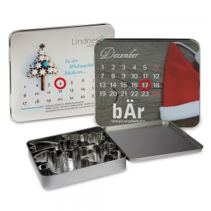 Artikel-Nr: HOP23.49631.00Die etwas andere Art von Adventskalender. Mit dem kleinen Magnetring markieren Sie das aktuelle Datum. Im Inneren der silbernen Dose sind 4 weihnachtliche Backförmchen enthalten. Der Deckel ist komplett individuell im Digitaldruck bedruckbar. Die Backförmchen sind aus Edelstahl gefertigt und spülmaschinenfest.