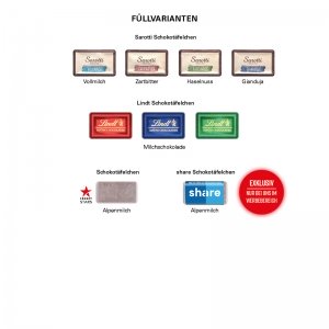 Füllvarianten: 24 Sarotti Schokoladentäfelchen, 4 Sorten oder 24 Lindt Schokotäfelchen oder 24 Alpenmilch-Schokotäfelchen oder 24 share Schokotäfelchen