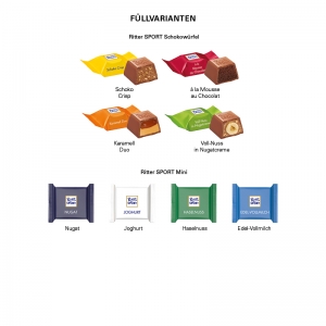Füllvarianten: 24 Ritter SPORT Schokowürfel, 4 Sorten oder 24 Ritter SPORT mini, 4 Sorten