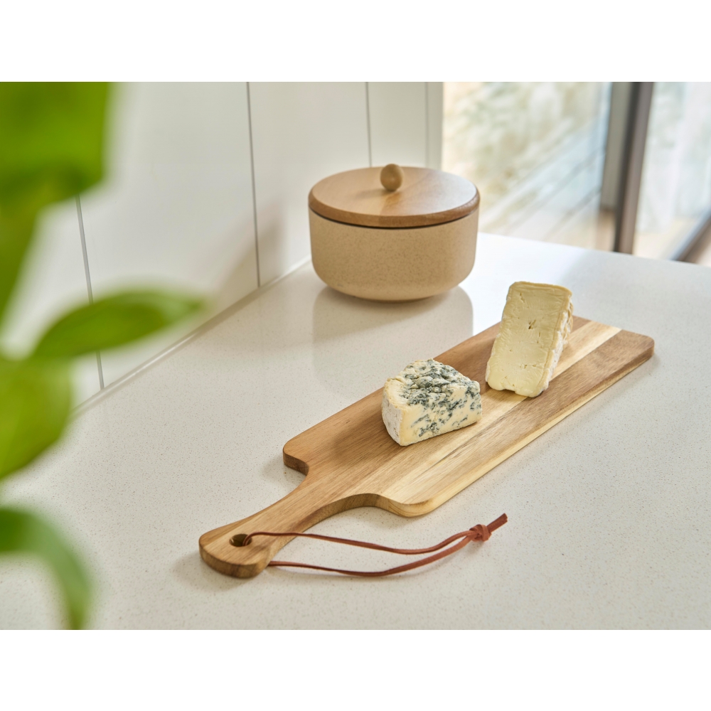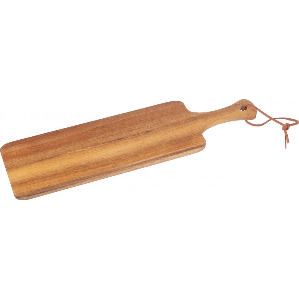 Artikel-Nr: GIV1097591011Schneidebrett aus Akazienholz mit Griff und PU-Schnur. Einzeln verpackt in einem braunen Karton.