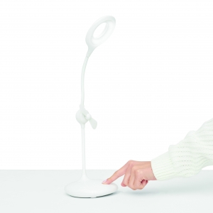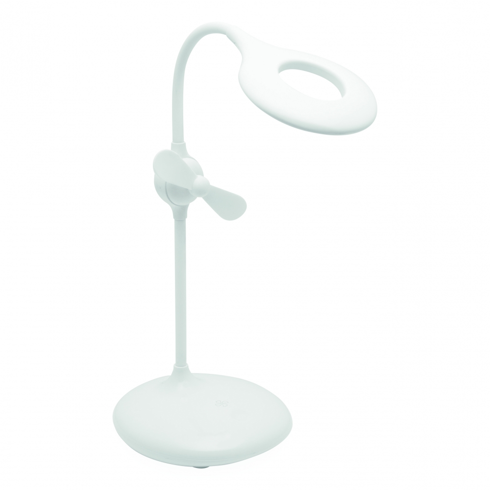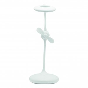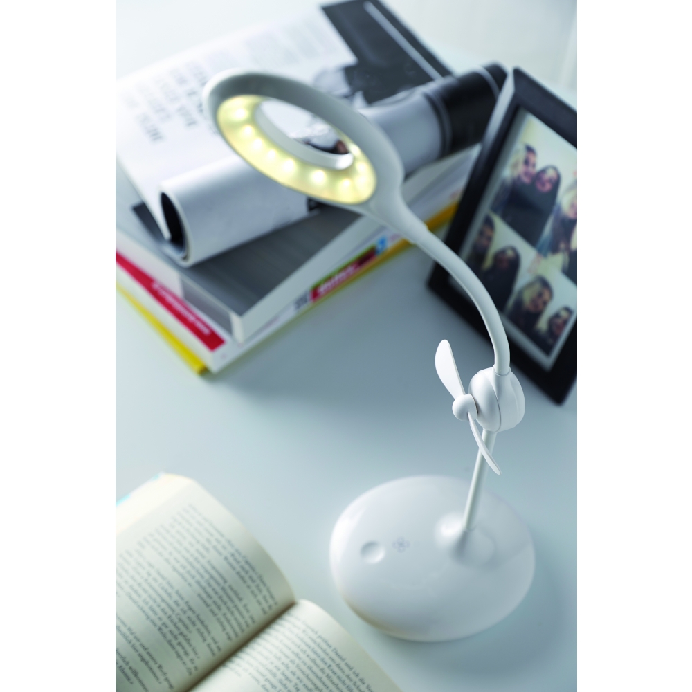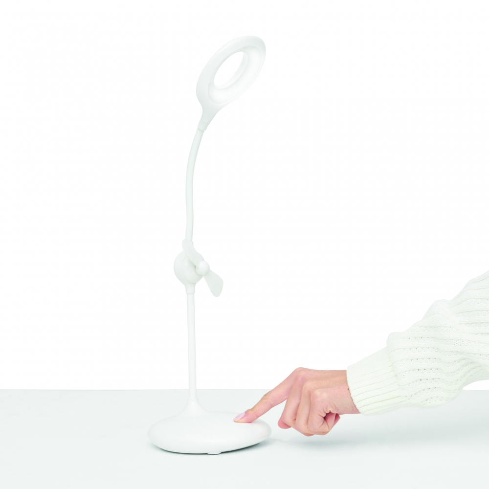 Artikel-Nr: INP58-8116004Akku-Lampe mit Ventilator FRESH LIGHT: 360° flexiblel schwenkbarer Leuchtarm mit 16 LED, An und Aus per Fingertipp, Dimmfunktion durch lange Berührung, integrierter Ventilator mit separatem Berührungssensor, inkl. USB-Ladekabel (Länge ca. 100 cm), flexibel einsetzbar dank integriertem Lithium-Akku mit 1.200 mAh, 4 rutschhemmende Füße auf der Unterseite, in Box