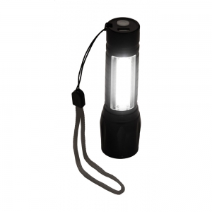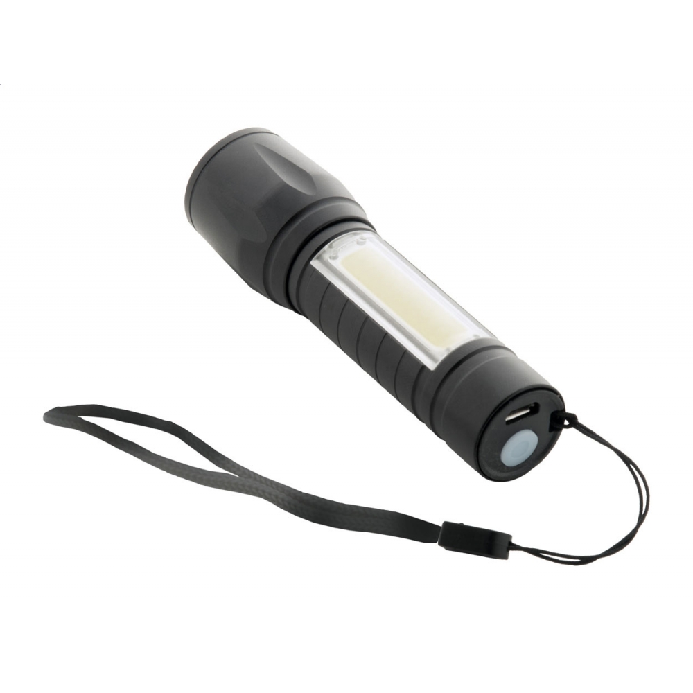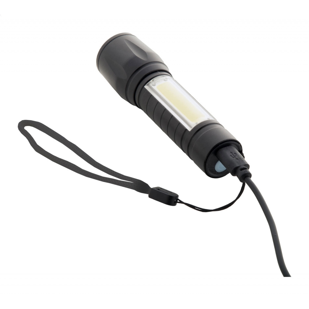 Artikel-Nr: AND808126Aluminium-Taschenlampe mit integriertem USB-Akku (400 mAh) und Tragegurt. Mit zoombarem Hochleistungs-COB-Licht an der Vorderseite und COB-Flutlicht an der Seite. Mit anhaltenden und blinkenden Lichtmodi. Inkl. USB-Ladekabel.