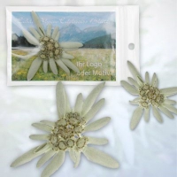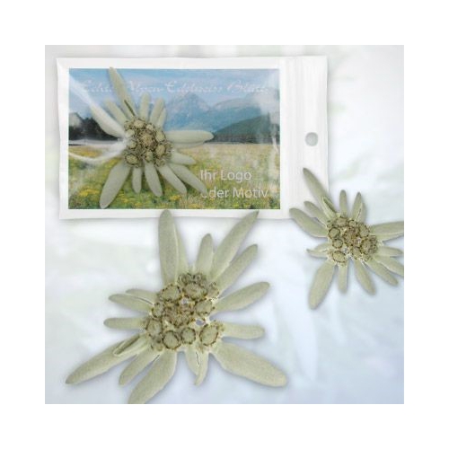 Artikel-Nr: WEdelweissOriginal echte Edelweiss-Blüte getrocknet (Leontopodium alpinum) in exzellenter Qualität aus ökologischer Handaufzucht in Höhenlagen. Durchmesser ca. 40 - 60 mm/Stück. Natürlich freigegeben vom Bundesamt für Naturschutz, da aus Nachzuchten. Verpackung: In transparentem Druckverschlussbeutel mit weisser Karte. Kartengröße ca. 90 x 55 mm. Eine individuelle Bedruckung der Karte ist möglich. Ideal als OnPack, als Beigabe und als Mailingartikel.
