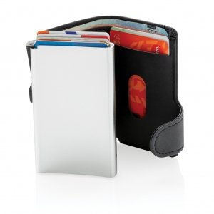 Artikel-Nr: XND850341Dieser Kartenhalter aus Aluminium mit PU-Börse schützt vor elektronischem Datenklau. Ebenso haben Sie nie wieder verbogene oder gebrochene Karten. Für bis zu 10 Karten oder 6 geprägte Karten. Mit dem Easy-Slider schieben Sie die Karten stufenweise heraus.