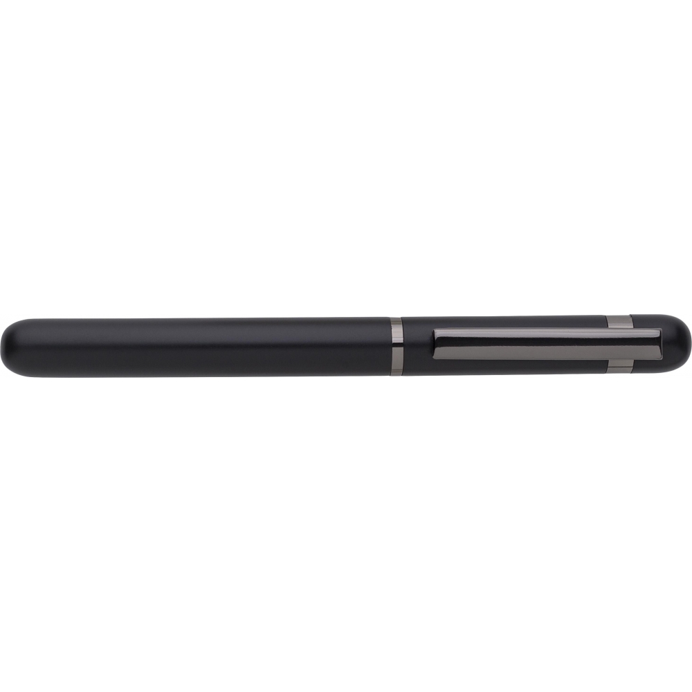 Artikel-Nr: GIV1014845001128Rollerball-Kugelschreiber aus Aluminium und Messing. Mit glänzenden Details an Clip, Ring und Druckknopf. Blaue Tinte. Einzeln verpackt in magnetischer Geschenkbox mit Papierhülle.