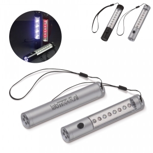 Artikel-Nr: ART90997N0005LED-Taschenlampe aus Aluminium mit je einer Lampe auf der Vorder- und Oberseite. Blitz- und statisches Licht sind möglich. Auf der Rückseite sind Magneten für einen sicheren Halt angebracht. Lieferung in einer Geschenkverpackung mit Batterien und einer Handschlaufe.