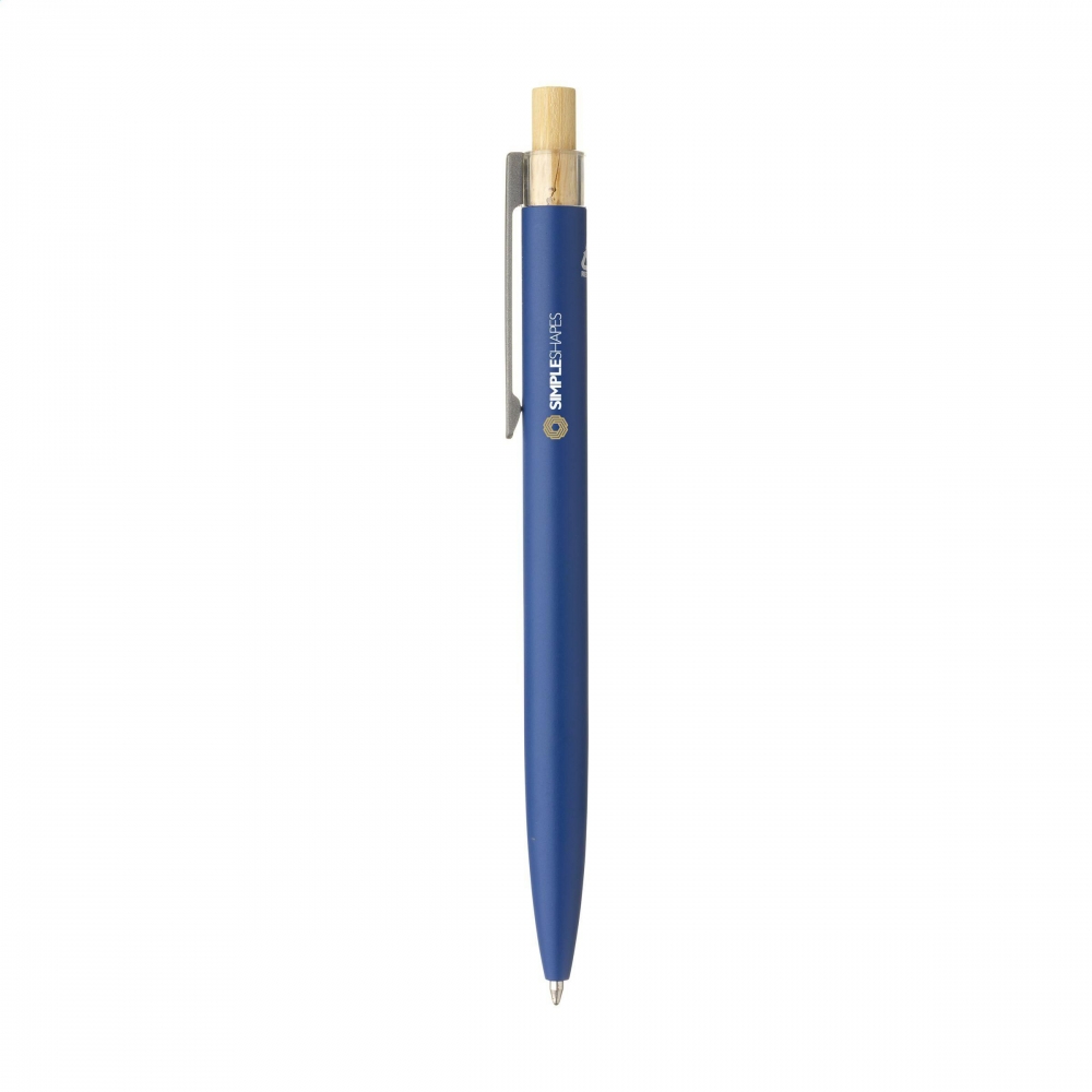 Artikel-Nr: CLP261052-536128Modischer, blauschreibender Kugelschreiber mit einem Gehäuse aus 100% recyceltem Aluminium mit mattem Finish. Der Druckknopf aus Bambus ist mit einem transparenten Akzent versehen. Das Gehäuse besteht aus einem Stück und ist standardmäßig mit dem Logo 'Recycled Aluminium' bedruckt. GRS-zertifiziert. Durch die Verwendung von recyceltem Aluminium werden bei der Herstellung dieses Produkts weniger neue Rohstoffe verwendet. Das bedeutet weniger Energieverbrauch und weniger Wasserverbrauch.