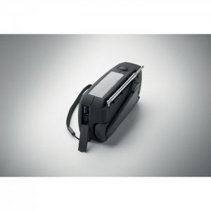 Artikel-Nr: OCBMO2746-03Tragbares AM / FM-Radio mit LED-Taschenlampe (2 Einstellungen) und 1200mAh Powerbank zum Notfall-Aufladen. Aufladen per Solarladefunktion und Handkurbel-Dynamo. ABS.