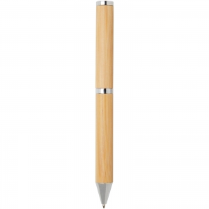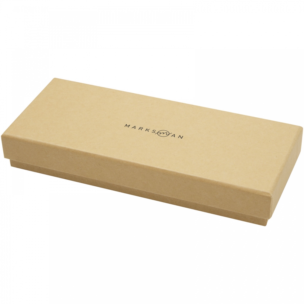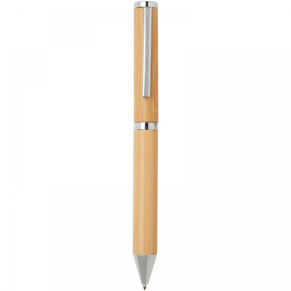 Artikel-Nr: CPO10783306Präsentset bestehend aus einem Kugelschreiber und einem Tintenroller mit Stifthülsen aus Bambus. Bambus ist ein erneuerbarer Rohstoff und eine nachhaltigere Wahl für die Herstellung von Stiften. Alle anderen Bestandteile dieses Stiftsets sind aus glänzend verchromtem, recyceltem Messing gefertigt. Durch das Recycling von Messing wird der Bedarf an der Gewinnung und Veredelung neuer Rohstoffe verringert, was die natürlichen Ressourcen schont. Mit dem Kauf eines Stiftsets mit Stifthülsen aus Bambus und recyceltem Messing unterstützen Sie nachhaltige Beschaffungs- und Recyclingpraktiken. Diese Kombination ermöglicht es Ihnen, Schreibgeräte zu verwenden, die zugleich stilvoll und umweltbewusst sind. Geliefert in einer Schachtel aus Kraftpapier mit gelber Seidenschleife. Tintenfarbe des Stifts: Schwarz. Box Größe: 16,8 x 7 x 2,7 cm.