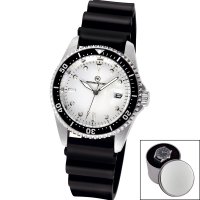 Artikel-Nr: 57329480CH-00Metallgehäuse gebürstet mit hochwertiger IP-Beschichtung, drehbare Lünette und Kronenschutz, wasserdicht 5 bar nach DIN 8310, robustes PU-Sportarmband mit Edelstahl-Dornschließe, gehärtetes Mineralglas mit aufgesetzter Datumslupe, 12 Uhr Punkt auf Lünette sowie Zeiger und Stundenindex fluoreszierend, Markenuhrwerk von Miyota (by CITIZEN) mit Datumsfunktion, 5 Jahre Garantie, Metalldose inkl.