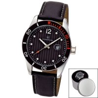 Artikel-Nr: 57321785SW-SWMetallgehäuse glänzend mit hochwertiger IP-Beschichtung, wasserdicht 3 bar, Echtlederarmband aus feinstem Rindsleder mit Edelstahl-Dornschließe, gehärtetes Mineralglas mit aufgesetzter Datumslupe, Zeiger und Stundenindex fluoreszierend, Markenuhrwerk von Miyota (by CITIZEN) mit Datumsfunktion, 5 Jahre Garantie, Metalldose inkl.