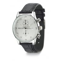 Metallgehäuse in glänzendem Chrom Uhrwerk mit Chronograph 1/1 Sek. und Datumsanzeige gebürstetes, silbernes Ziffernblatt geätzter Index gedrucktes Logo Lederarmband in Kroko-Optik wasserdicht 3ATM