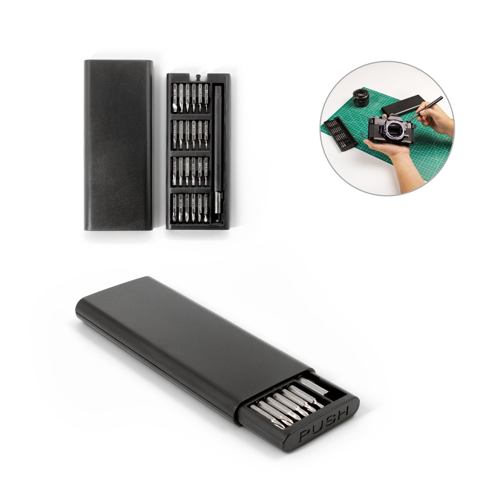 Artikel-Nr: PST98167-103Schraubendreher-Set mit magnetischen Spitzen, die je nach Bedarf gewechselt werden können. Das Gehäuse aus recyceltem ABS (100% rABS) verfügt über einen Magnetverschluss und Drucköffnung und enthält 1 Schraubendrehergriff sowie 24 Spitzen aus Carbonstahl. Lieferung in Geschenkbox aus Kraftpapier 166 x 67 x 18 mm