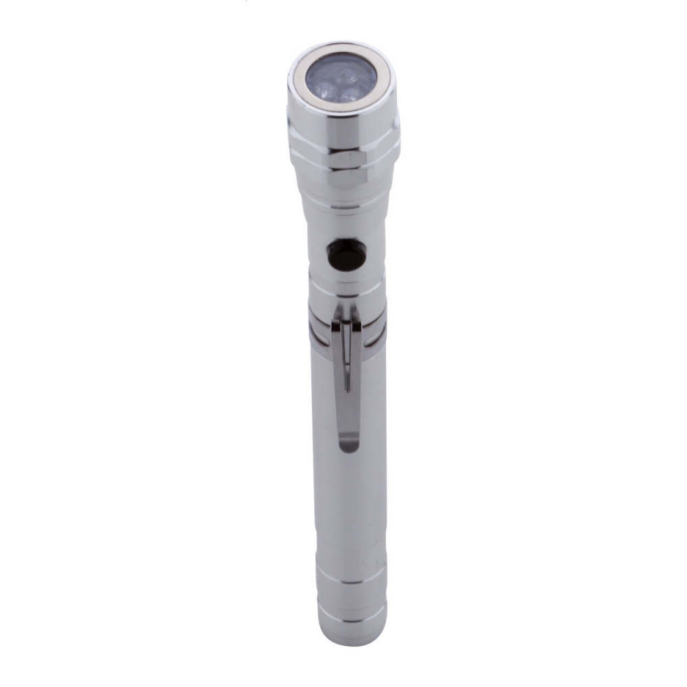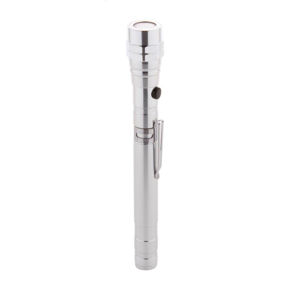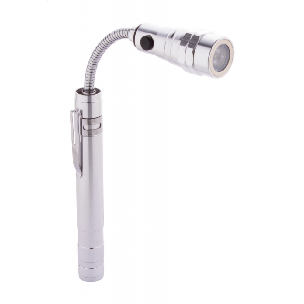 Artikel-Nr: AND844050-21Aluminium-Taschenlampe mit 3 LED's, ausziehbarem und flexiblem Kopf, Magnet an der Oberseite und seitlichem Metallclip. Inklusive Knopfzellenbatterien. Max. Länge: 57 cm.